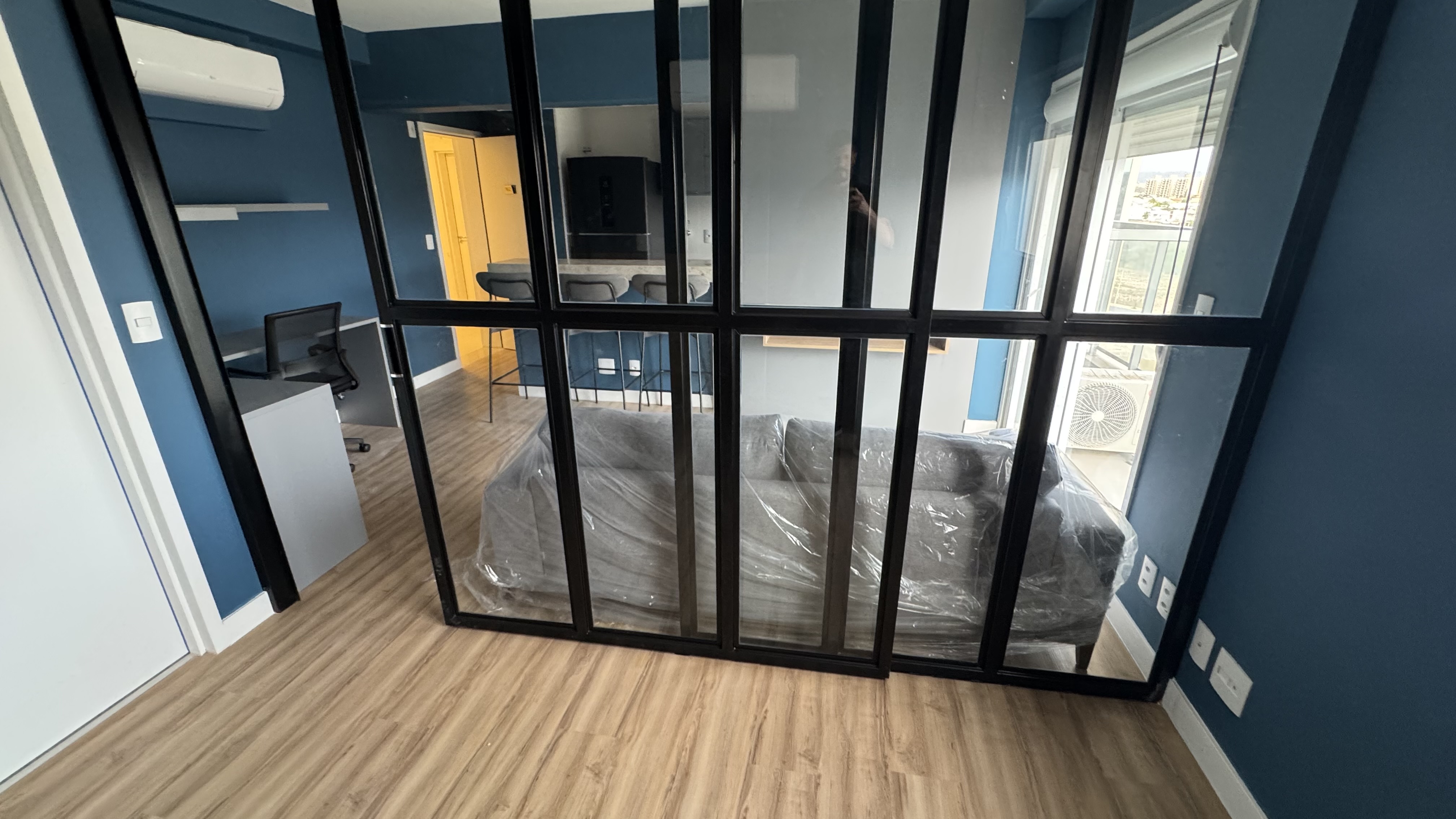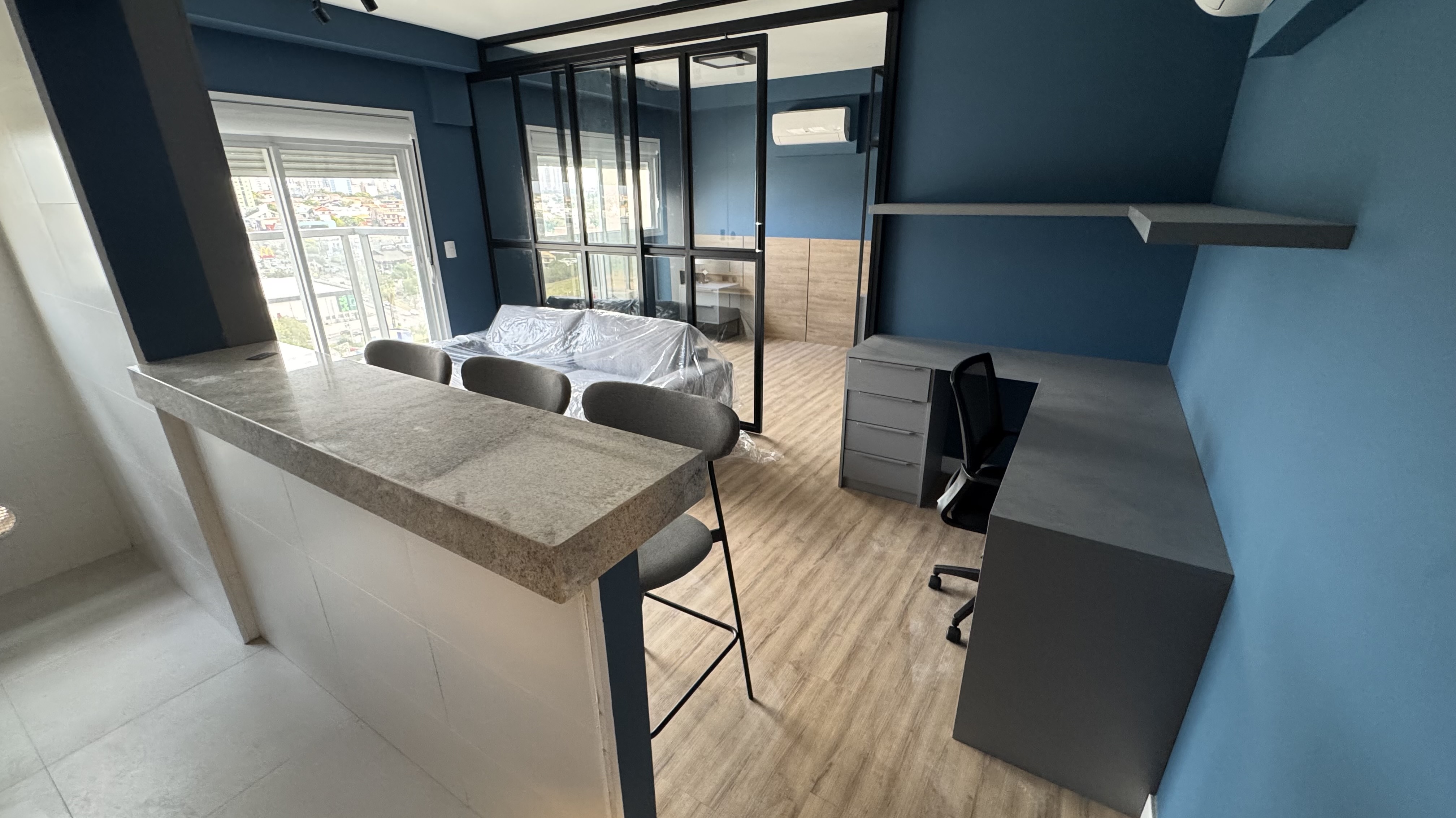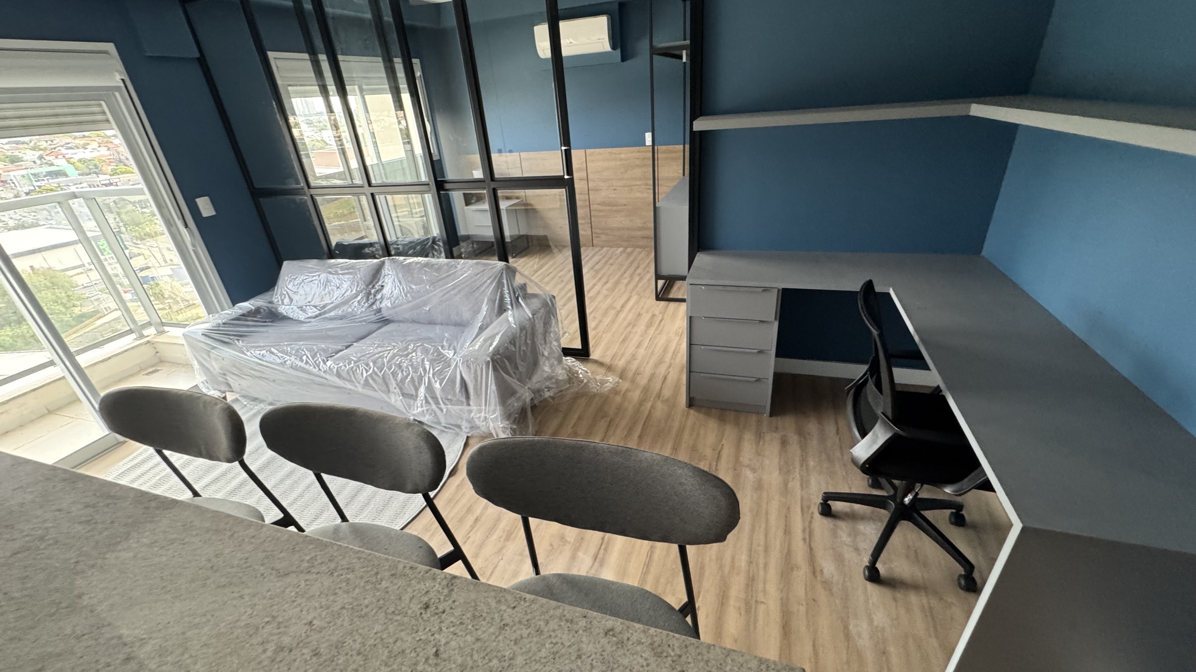Apartamento Studio com área privativa de 37,00 m², localizado no 16º andar, mobiliado decorado com móveis planejados, sendo um quarto com suíte, sala dois ambientes, varanda, cozinha americana e garagem com uma vaga.